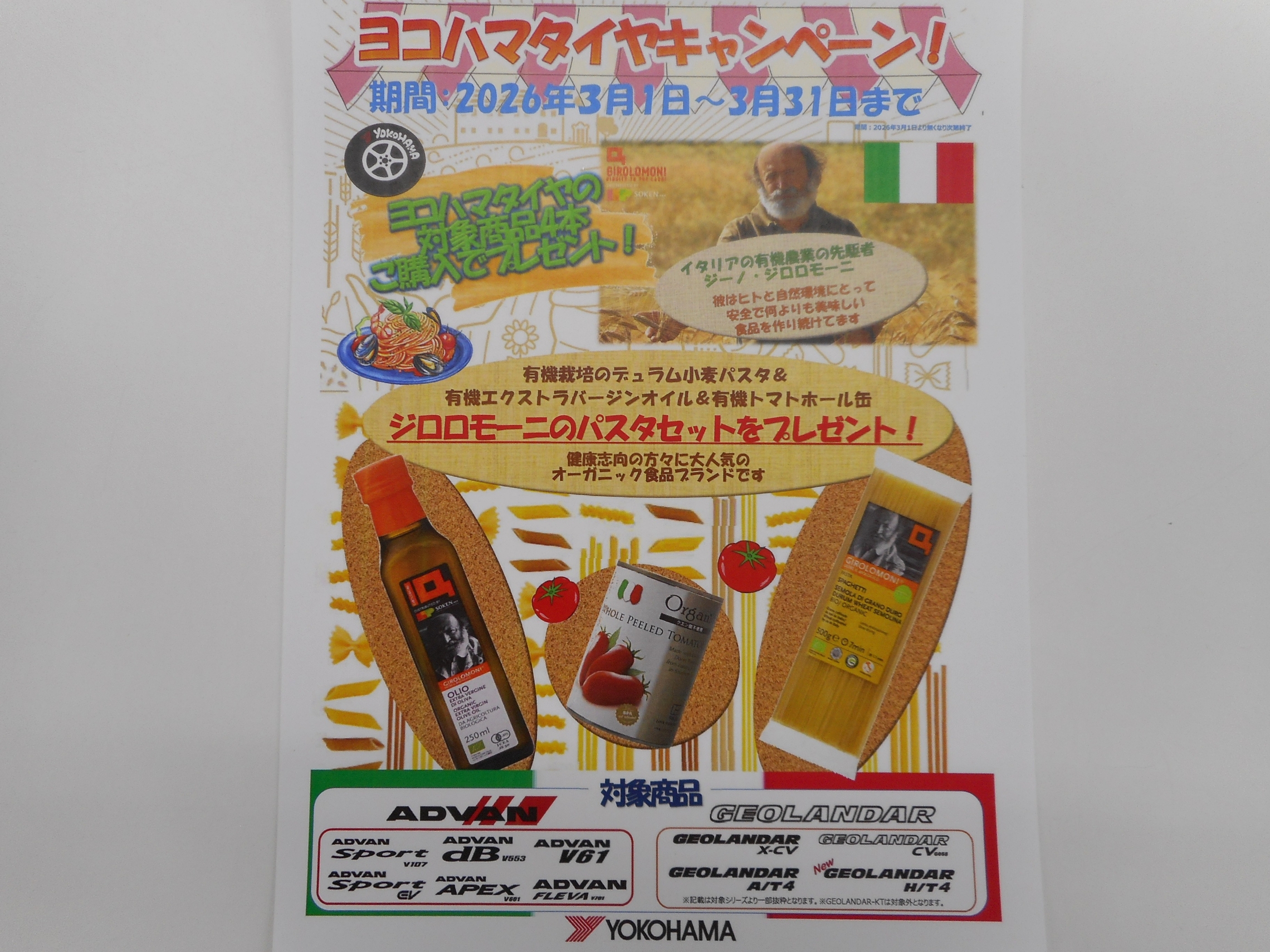対象商品のタイヤ4本をご購入いただきますと、人気ブランドのパスタセットを