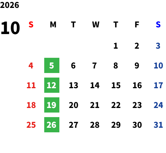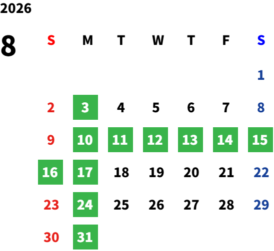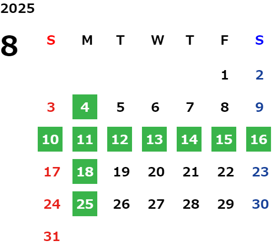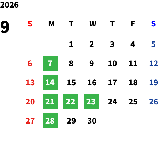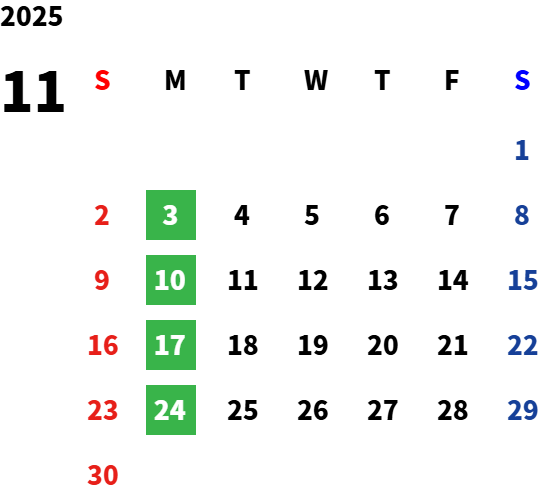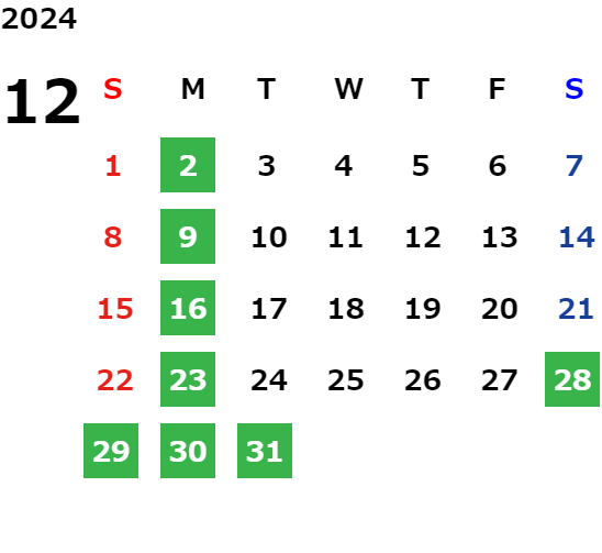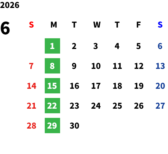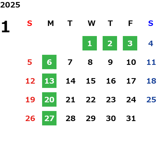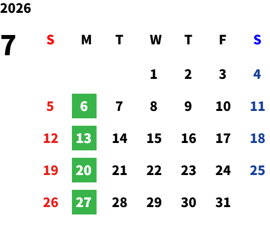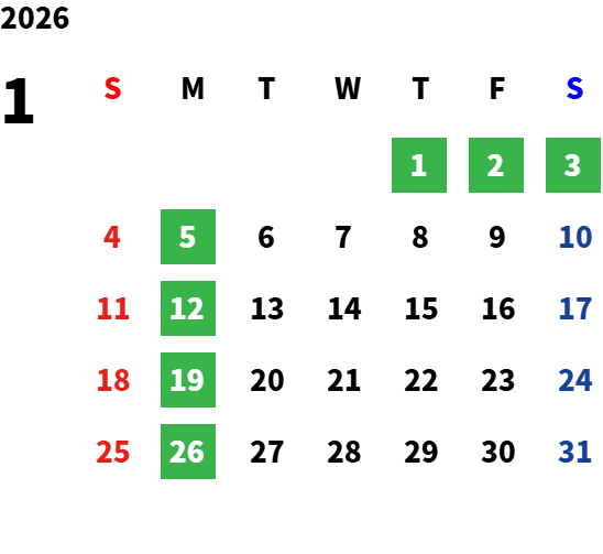 毎週月曜日(一部祝日営業日あり)詳しくは営業日カレンダーをご確認ください。